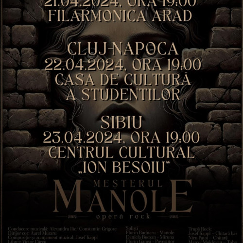 Spectacolul fenomen al anului - MEŞTERUL MANOLE – OPERĂ ROCK ÎN CONCERT ajunge la ARAD pe 21 Aprilie Spectacolul fenomen MEŞTERUL MANOLE – OPERĂ ROCK în concert porneşte în turneu naţional în luna aprilie şi ajunge la Arad pe 21 Aprilie. Spectacolul va avea loc la Filarmonica Arad. Producţia Teatrului Naţional de Operetă şi Musical Ion Dacian se joacă cu casa închisă în Bucureşti, de la premiera ce a avut loc pe 14 ianuarie, iar biletele sunt epuizate în avans până în luna aprilie, cu un număr de 4 reprezentații sold out. Potrivit domnului Radu Petrovici, manager interimar al Teatrului Naţional de Operetă şi Musical Ion Dacian din Bucureşti, spectacolul concretizează misiunea instituţiei de a ajunge la un public cât mai larg: “Dorim să fim aproape de fiecare spectator, astfel că în luna aprilie pornim în TURNEU NAȚIONAL cu cea mai nouă producție a Teatrului Naţional de Operetă şi Musical Ion Dacian.” MEŞTERUL MANOLE – OPERĂ ROCK în concert va ajunge ÎN PREMIERĂ la Arad, Cluj-Napoca şi Sibiu după următorul program: 21 Aprilie – Arad – Filarmonica Arad 22 Aprilie – Cluj-Napoca – Casa de Cultură a Studenţilor 23 Aprilie – Sibiu – Centrul Cultural Ion Besoiu. Biletele pentru turneu se găsesc pe More.com la preţuri cuprinse între: 180 lei şi 270 lei. Geneza spectacolului MEŞTERUL MANOLE – OPERĂ ROCK istorisită de Josef Ioji Kappl Spectacolul “MEŞTERUL MANOLE – OPERĂ ROCK” are în spate o istorie fascinantă, ce merge înapoi în timp până în anul 1973 când formaţia Phoenix a dorit să pună în scenă o versiune rock a celebrei balade populare, pe un libret de Victor Cârcu şi pe muzica semnată de Josef Ioji Kappl, însă demersul le-a fost zădărnicit de cenzura comunistă. Asemene comorilor ce îşi găsesc drumul spre cel care le merită, libretul lucrării şi-a găsit în mod miraculous cărarea către muzicianul Josef Ioji Kappl în anul 2008, după cum a relatat chiar celebrul basist pe pagina sa de Facebook: “Într-o bună zi din vara anului 2008, apărea pe blogul meu de atunci un mesaj care anunța apariția pe internet a unei broșuri interesante. Să vezi şi să nu crezi, era libretul Operei Rock „MEȘTERUL MANOLE“, de Victor Cârcu. Bine-nțeles că îndată ce citisem acestea, am intrat pe internet şi am cumpărat ultimele două exemplare ale broșurii. După ce am intrat în posesia lor, l-am sunat pe Victor Cârcu, ca să-l felicit pentru apariția broșurii şi să-mi exprim totodată surprinderea, considerând că libretul ar fi fost pierdut pe vecie, după ce fusese neaprobat și respins în anul 1973 de cenzura comunistă, atunci când a fost conceput pentru Formația Phoenix, care urma să creeze o Operă Rock pe baza lui. În această discuție cu Victor Cârcu s-a născut ideea şi dorința, de a-i trezi pe Manole și Miruna (Ana) şi pe cei 9 meșteri ai lui, din somnul de peste un sfert de veac de când fusese creat libretul, legate și de obligația morală de a duce pân’ la capăt ceea ce ne-am propus să facem atunci, când nu era posibil! Astfel rămân cu speranța de a continua cât mai intens călătoria mea cu “Meșterul” în cât mai multe orașe, atât în țară, cât și de ce nu, peste hotare, pentru a putea presăra pretutindeni câteva scântei din cultura românilor!” Despre producţia MEŞTERUL MANOLE – OPERĂ ROCK „MEŞTERUL MANOLE – OPERĂ ROCK” este o experiență captivantă care aduce în lumina reflectoarelor unul dintre cele mai fascinante mituri ale culturii românești. Cu o interpretare modernă și puternică, acest spectacol-concert combină muzica rock vibrantă cu povestea tragică a lui Manole, construind un univers emoționant și captivant pentru public. Prin intermediul unei partituri muzicale puternice și a unei distribuții talentate, spectacolul își propune să treacă dincolo de limitele timpului și să aducă în prezent povestea universală a unui erou încercat de contradicţiile lumii sale. Cu scene dramatice, momente intense și o muzică care îmbină elemente contemporane cu influențe din folclorul românesc, "Meșterul Manole - Opera rock" surprinde esența trăirilor umane profunde și a luptei interioare a personajelor. Această producție reprezintă o călătorie emoțională și sonoră într-un univers mitic, în care sacrificiul și pasiunea pentru creație se întâlnesc într-un tablou fascinant. Spectacolul-concert „ MEŞTERUL MANOLE – OPERĂ ROCK” este destinat nu doar iubitorilor de muzică rock, ci și celor pasionați de mitologie și de povestiri epice. Este o experiență ce transcendă genurile, aducând în prim-plan valori și dileme umane care continuă să fascineze și să inspire în orice epocă. „Opera reprezintă o lucrare muzicală amplă, pe un libret scris în anii '70 de Victor Cârcu. Această lucrare poate fi prezentată atât sub forma operei clasice, cât și sub formă concertantă. Nașterea «Meșterului Manole» a fost la fel de grea ca și realizarea construcțiilor acestuia. Greutatea a constat, în primul rând, în găsirea limbajului muzical care să fie în concordanță cu textul. În momentul în care am găsit acest limbaj, de inspirație folclorică, bineînțeles, am început lucrul, care a durat din 2008 până astăzi (2013), cu o întrerupere de doi ani.” – Josef Kappl Compoziție și aranjament muzical: Josef Kappl Libret: Victor Cârcu Scenografie: Vladimir Turturica Coregrafie: Relu Dobrin Asistent regie: Sorina Micșunescu Concept: Radu Petrovici și Rebecca Diaconu