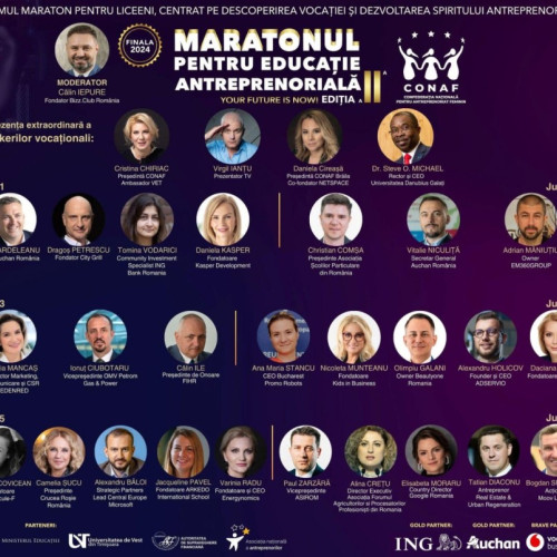 Aradul a ajuns cu trei echipe - Colegiul Economic din Arad, Liceul „Ioan Buteanu” din Gurahonț și Liceul „Sever Bocu” din Lipova, în marea finală a celei mai ample competiții de planuri de afaceri din România, „Maratonul pentru Educație Antreprenorială”, finală la care participă 60 de echipe din 20 de județe! • Aproape 1.000 de liceeni s-au transformat din pioni în campioni autentici ai antreprenoriatului. • Inițiativă care motivează, inspiră și dă speranță liceenilor că România se aliniază direcțiilor strategice ale Uniunii Europene. Azi, la ora 09:30, sala Aula Magna Teoctist Patriarhul din Palatul Patriarhiei, București, a fost transformată într-un hub fresh pentru cele 60 de echipe de liceeni calificate la marea finală „Maratonul pentru Educație Antreprenorială”- ediția a II a, competiție de planuri de afaceri, parte a programului național omonim adresat liceenilor și organizat de Confederația Națională pentru Antreprenoriat Feminin (CONAF) în parteneriat cu Ministerul Educației, Universitatea de Vest din Timișoara, Autoritatea de Supraveghere Financiară și Asociația Națională a Antreprenorilor. Programul este susținut de Auchan România (Gold Partner) și Vodafone Business (Brave Partner). Peste 400 de liceeni câștigători ai primelor trei locuri din semifinalele organizate în 20 județe ale țării și-au antrenat energiile creative pentru a se confrunta în finala competiției care va desemna cel mai bun plan de afaceri. La semifinale au participat cca 1.000 liceeni, care au fost instruiți pentru a se transforma din pioni în campioni autentici ai antreprenoriatului, grupați în 155 de echipe. Peste 50.000 euro reprezintă valoarea premiilor cumulate care sunt oferite anul acesta, în cadrul maratonului, tinerilor care s-au remarcat prin inovație, spirit de echipă și curaj. Premii generoase În marea finală echipele câștigătoare vor fi onorate cu premii generoase, un impuls vital pentru continuarea parcursului lor antreprenorial: Premiul 1 - 10.000 lei, Premiul 2 - 5.000 lei, Premiul 3 - 2.500 lei. Nu mai puțin de 30 de mențiuni in valoare de 1.500 lei fiecare vor fi acordate pentru a recunoaște și încuraja eforturile tinerilor. În plus, trei premii speciale, cumulând 14.500 de lei, vor fi destinate recunoașterii excelenței în categorii unice, subliniind diversitatea și creativitatea abordărilor antreprenoriale ale tinerilor. La 35 de ani de democrație, CONAF dă startul ”Maratonului pentru Educație Antreprenorială”, cel mai mare concurs de planuri de afaceri din România, o călătorie a liceenilor despre descoperirea de sine, despre curajul de a urma un drum autentic, despre identificarea vocației, îndrumați de profesori și de mentori voluntari, care le oferă un real suport în alegerea viitoarei cariere în care își vor valorifica abilitățile dobândite. „Este încununarea unui demers la nivelul tuturor regiunilor României, un parcurs prin care nu doar elevii au avut de câștigat, ci și fiecare comunitate antreprenorială implicată. Educația este un schimb în ambele direcții, iar inputurile generației tinere sunt valoroase pentru dezvoltarea economiei la nivelul întregii țări. Comunitățile locale de antreprenori au reușit o premieră fără precedent în istoria modernă autohtonă și anume o convergență trans-generațională în direcția unei dezvoltări sustenabile printr-un parcurs educațional durabil, bazat pe schimbul de idei, pe modele de bune practici, pe bucuria sintagmei «se poate!». Am pus capete de pod în destinele a sute de elevi direct implicați în scrierea și susținerea de proiecte și dacă acestui număr adăugam cele câteva mii de elevi, precum și cei aproape 200 de profesori participanți, avem o dimensiune reală a ceea ce acest la propriu numit maraton, a reușit”, afirmă Cristina Chiriac, președinta CONAF. Marea finală va fi moderată de Călin IEPURE, expert în public speaking, arta influenței, improvizație, negociere și creșterea vânzărilor. Evenimentul va fi deschis de Cristina CHIRIAC, președinta CONAF și Fondator Flori de Ie. Au fost invitați președintele Senatului României – Nicolae CIUCĂ, prim-ministrul României – Marcel CIOLACU și ministrul Educației – Ligia DECA. Momentul de inspirație va fi oferit de Virgil IANȚU, prezentator TV. Juriul etapei naționale este format din antreprenori cu notorietate, vectori ai mediului de business la nivel național, care vor puncta ideea de afaceri, punerea în aplicare, rezultatele prevăzute prin planul de afaceri, lucrul în echipă prin identificarea rolului corect pentru fiecare membru al echipei, precum şi modalitatea de prezentare: Fondatoarea Kids in Business - Nicoleta MUNTEANU, Antreprenorul Real Estate & Urban Regeneration - Tatian DIACONU, Fondatoarea Kasper Development - Daniela KASPER, Fondatorul și Președintele Asociației Școlilor Particulare din România - Christian-Eneil COMȘA, Vicepreședintele ASIROM - Paul ZARZĂRĂ, Owner-ul Beautyone Romania - Olimpiu GALANI, Președintele City Grill - Dragoș PETRESCU, CEO-ul Auchan România - Ionuț ARDELEANU, Fondatoarea Molecule-F, Molecule PR și platforma Business Institute for Creative Industries - Mirela BUCOVICEAN, Secretarul General Auchan România - Vitalie NICULIȚĂ, Directoarea Marketing, Comunicare și CSR EDENRED - Lelia MANCAȘ, Owner-ul EM360GROUP - Adrian MĂNIUȚIU, Președintele Crucii Roşii Române - Camelia ȘUCU, Fondatoarea Mara Mura - Daciana SÂRBU, Directorul Executiv al Forumului Agricultorilor și Procesatorilor Profesioniști din România (FAPPR) - Alina CREȚU, Fondator și Președinte Adservio - Alexandru HOLICOV, Acționar majoritar Moov Leasing - Bogdan SPEȚEANU, Președinte de Onoare FIHR – Călin ILE, CEO-ul Bucharest Promo Robots - Ana Maria STANCU, Country Director Google România – Ela MORARU, Strategic Partners Lead pe Europa Centrală Microsoft