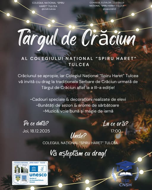 Colegiul Național Spiru Haret găzduiește, pe data de 18 decembrie, Târgul de Crăciun în incinta singurului colegiu național din Tulcea. Evenimentul începe la ora 17:00, după ce de la 16:30 are loc Serbarea Crăciunului, oferind invitaților o experiență completă cu colinde și preparate tradiționale proaspăt pregătite. Elevii sunt gazdele acestui târg, iar toate fondurile colectate vor fi donate unei cauze umanitare, se precizează pe pagina Consiliului Școlar al Elevilor CNSH.