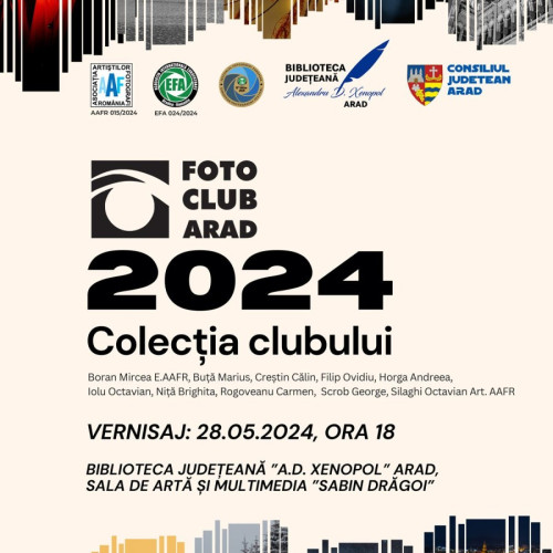 Marți, 28 mai 2024, începând cu orele 18:00, Biblioteca Județeană „Alexandru D. Xenopol” Arad, în parteneriat cu Asociația Foto Club Arad, vă lansează invitația de a participa la vernisajul Salonului de Fotografie „Colecția Foto Club Arad 2024”. Organizată sub prestigiosul patronaj al Asociației Artiștilor Fotografi din România (nr. 015/2024) și al Asociației Internaționale EuroFotoArt Oradea (nr. 024/2024), expoziția reunește 60 de fotografii realizate de: Boran Mircea E.AAFR, Buță Marius, Creștin Călin, Filip Ovidiu, Horga Andreea, Iolu Octavian, Niță Brighita, Rogoveanu Carmen, Scrob George, Silaghi Octavian Art. AAFR. Iubitorii de artă fotografică vor putea să admire diverse stiluri și numeroase tematici abordate, de la fotografia de portret ce surprinde esența și personalitatea umană, fotografia de reportaj ce relatează povești din viața de zi cu zi, oferind o ipostază autentică și emoționantă asupra realității cotidiene, la fotografia de peisaj ce capturează frumusețea naturii, fie că este vorba de munți impunători, câmpuri și dealuri sau apusuri spectaculoase, surprinzând splendoarea și complexitatea lumii înconjurătoare. Pot fi admirate de asemenea, fotografii ce surprind diversitatea și detaliile stilurilor arhitectonice, fotografii-eseu ce explorează o poveste sau o temă specifică sau fotografii ce surprind stele, constelații și peisaje cosmice spectaculoase și care evidențiază vastitatea și mistere universului. Vă invităm cu bucurie la Biblioteca Județeană „Alexandru D. Xenopol” Arad, Sala de Artă și Multimedia „Sabin Drăgoi”, să vorbim despre fotografie, despre pasiune și artă, despre perspective și tehnici, despre valori și identitate vizuală, într-un dialog interactiv susținut de Mircea O. Boran E.AAFR, președinte al Asociației Foto Club Arad, și prof. drd. Ioana Nistor, curatori ai Salonului de Fotografie „Colecția Foto Club Arad 2024”. După vernisaj, fotografiile selectate vor putea fi regăsite pe site-ul Foto Club Arad (https://fotoclubarad.ro/), afișul evenimentului fiind realizat de Monica Szentes. Iubitorii artei vizuale pot vizita „Colecția Foto Club Arad 2024”, în perioada 28 mai-9 iunie 2024, în mod gratuit, de luni până vineri, în intervalul orar 09:00-17:00, în cadrul spațiului cultural de expunere, Artoteca Bibliotecii Județene „Alexandru D. Xenopol” Arad (str. Gh. Popa de Teiuș 2-4, etaj I). Vă așteptăm cu drag să împărtășim împreună bucuria artei fotografice!