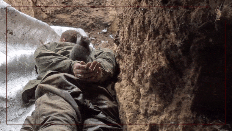 O pisică păzește un prizonier rus în tranșeele ucrainene